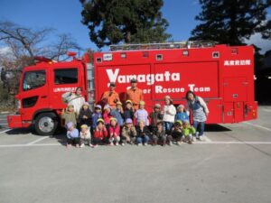 訓練後は、消防署の方と写真を撮っていただき、はしご車の